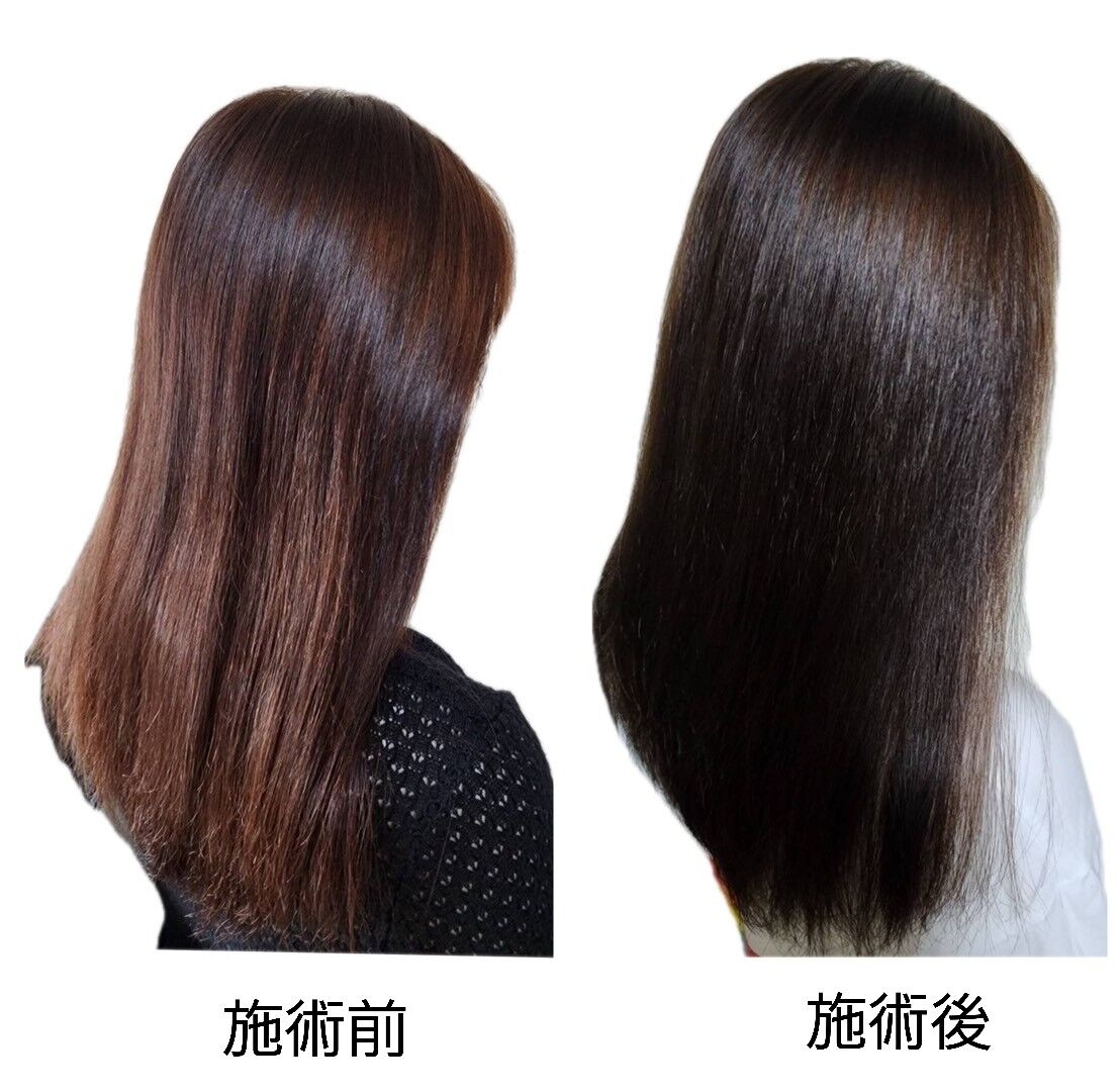 ノンジアミンのクリア感とハイブリッドパールシリーズの輝き感を利用して、赤味を抑えながらも暗くはしないレシピで施術しました