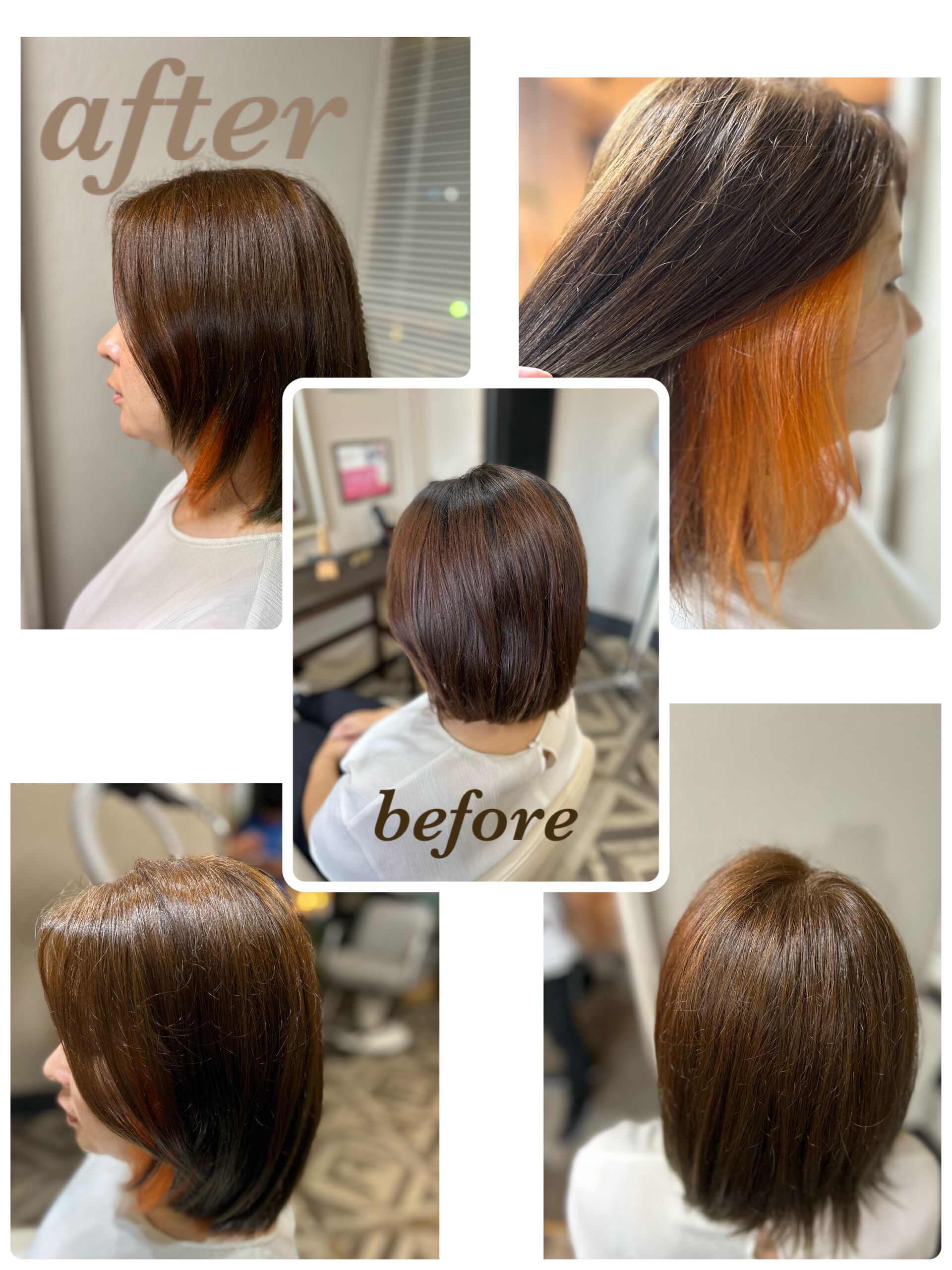 原色の発色を活かした、ノンジアミンヘルバならではのオレンジ色。ちなみにベースが明るければピンクも同様に綺麗な発色をします。